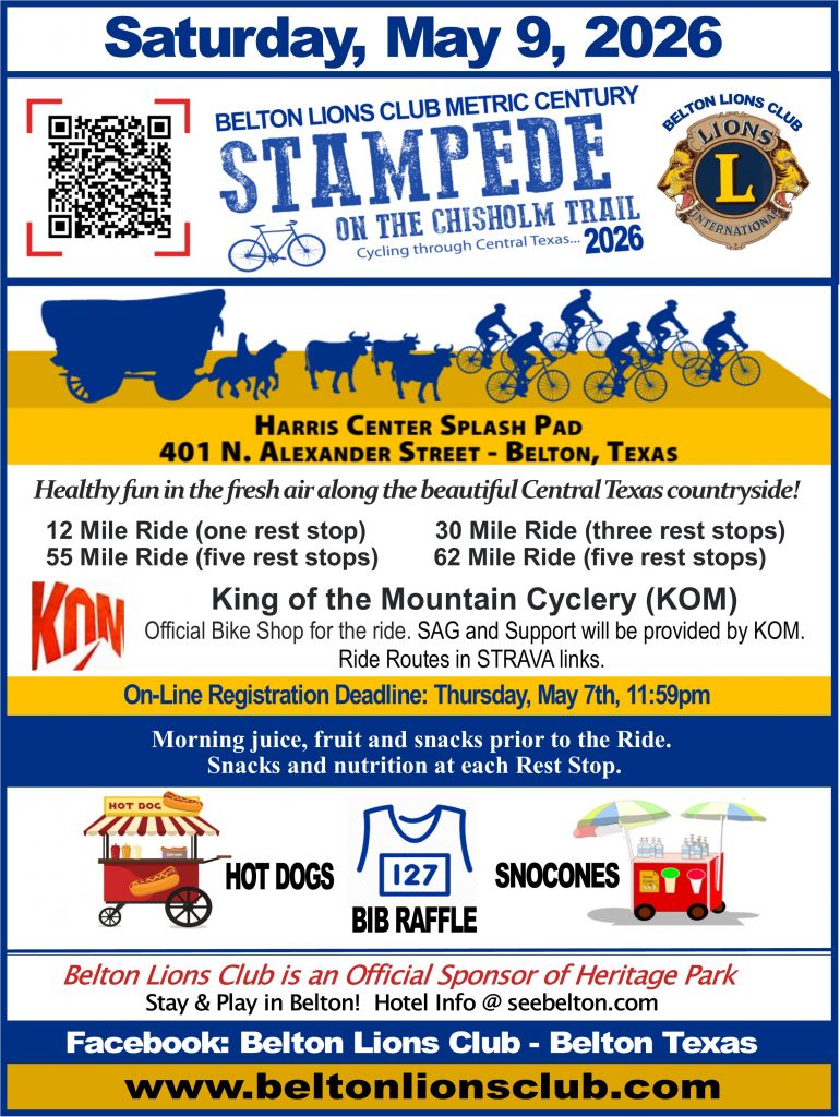 Please JOIN US for our STAMPEDE ON THE CHISHOLM TRAIL Metric Century 2026 to benefit Belton Lions.